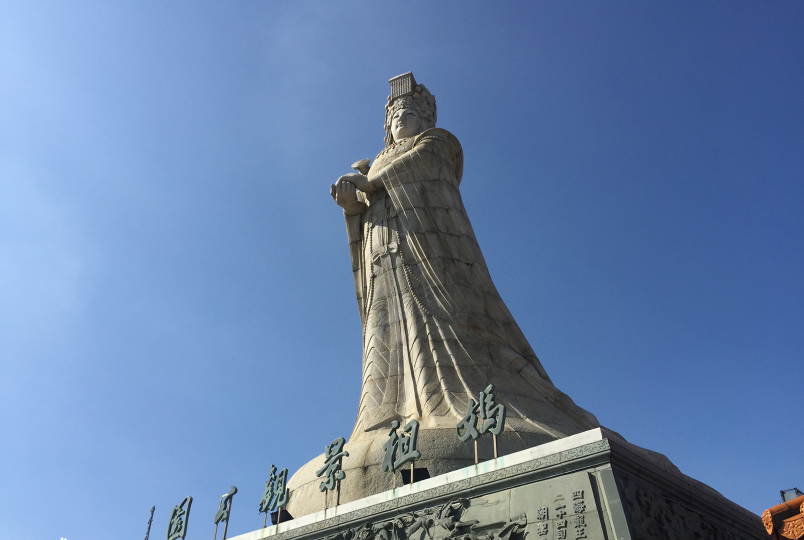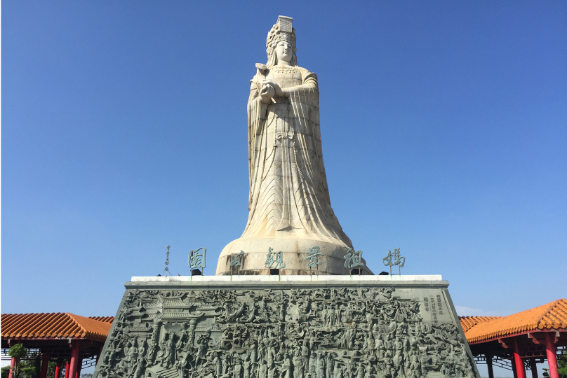 四樓屋頂設計中式古色古香庭園迴廊景觀公園面積近千坪,廣場中豎立一尊石雕媽祖像,石像由大陸廈門大學美術系李維祀教授設計,採立像手持如意象徵和平女神護佑兩岸人民,石像採用花崗岩打造,石像高14米9由357塊組合而成,石像底座高5米,正面採用青斗石雕刻四海龍王率24司朝拜媽祖,底座兩側雕刻24孝圖。