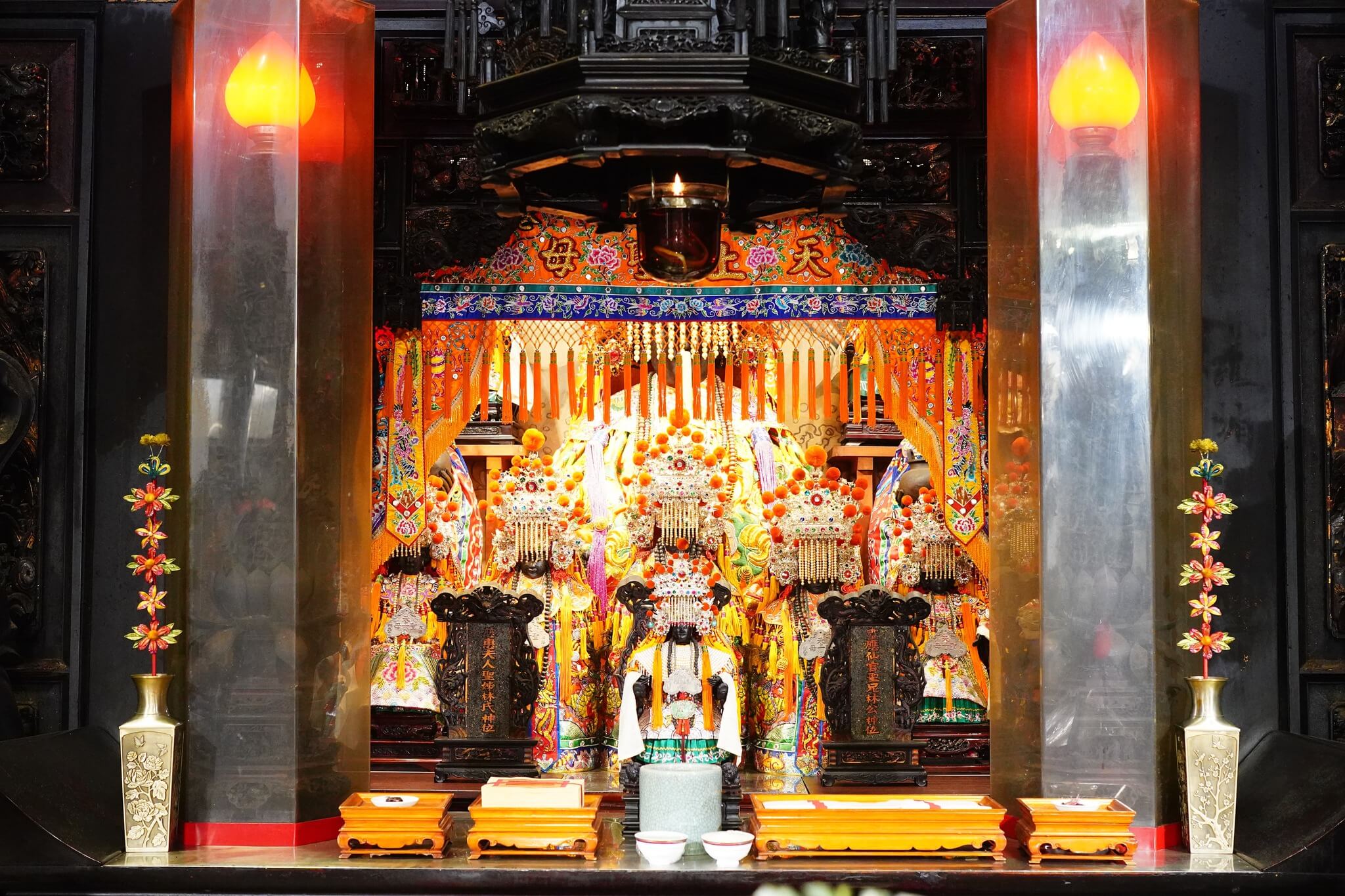 正殿內神龕所供奉的媽祖,主要有大小七尊神像。諸多神像皆有數百年歷史,彫塑風格古樸,輪廓圓融,不但深具歷史文物價值,亦深富藝術價值。
