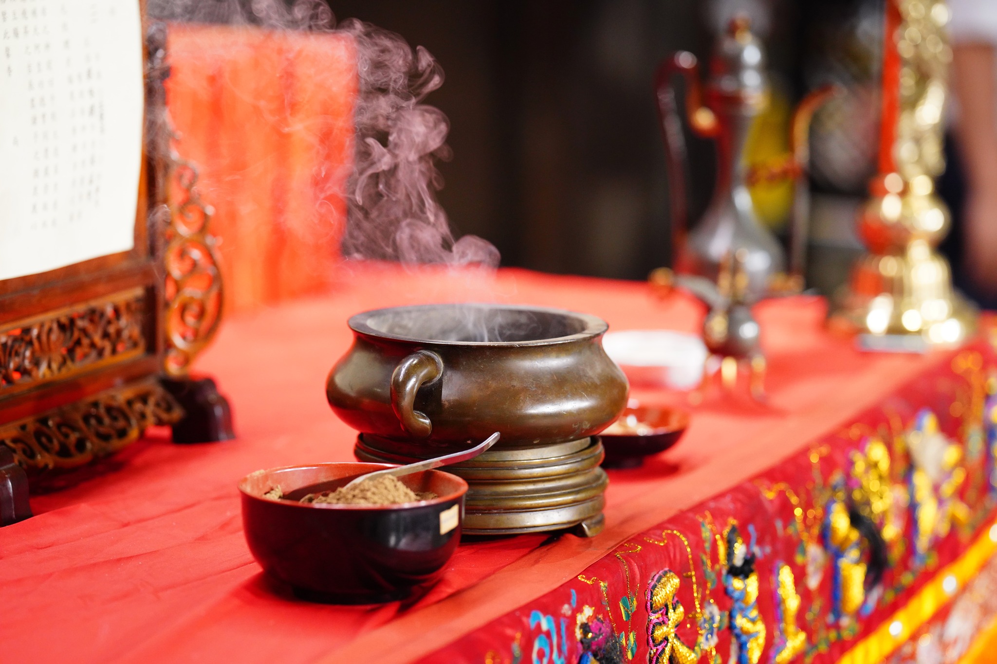 有些寺廟,會將香爐存放香擔內,香擔貼上封條,香擔留有一小圓孔,以便添加檀香木延續香火,不讓爐內香火熄滅。