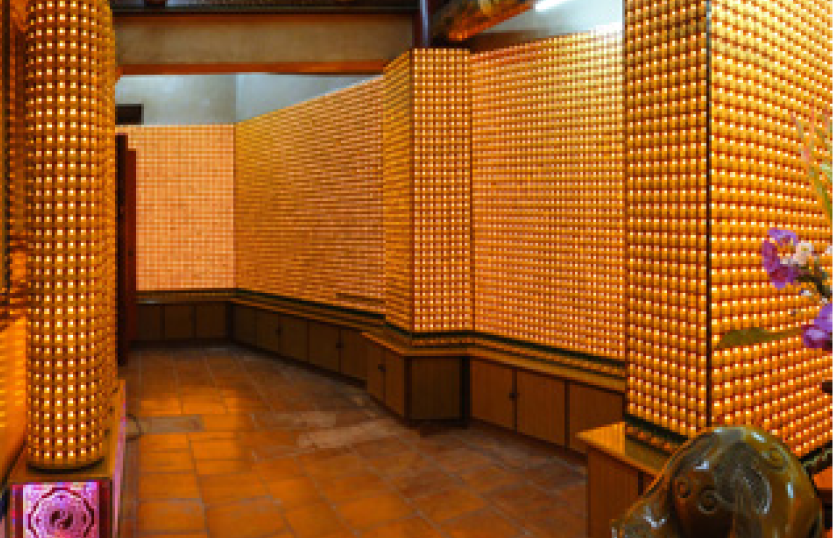 屋頂使用兩坡落水的「硬山式」,前面左右伸出「過水廊」,搭接於正殿之後門,而殿前留設方形天井,氣氛呈現佛寺貫有的幽靜。